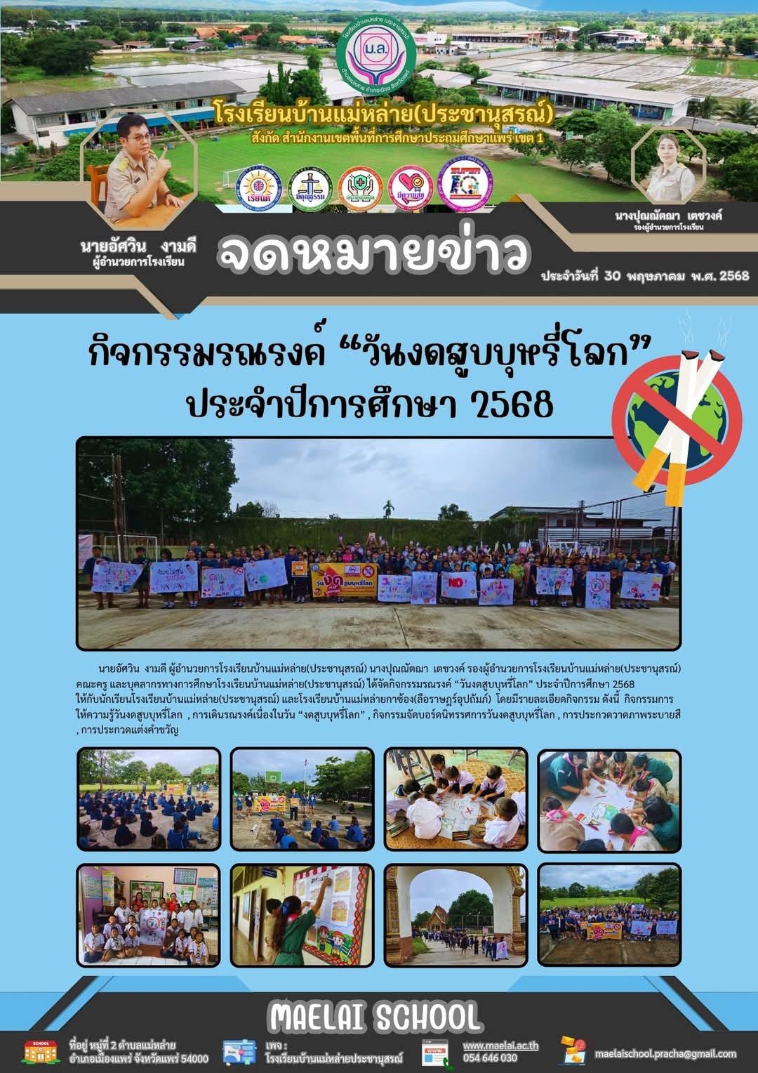 นายอัศวิน งามดี ผู้อ๋านวยการโรงเรียนบ้านแม่หล่าย(ประชานุสรณ์) นางปุณณัตณา เตชวงค์ รองผู้อํานวยการโรงเรียนบ้านแม่หล่าย(ประชานุสรณ์) คณะครู และบุคลากรทางการศึกษาโรงเรียนบ้านแม่หล่าย(ประชานุสรณ์) ได้จัดกิจกรรมรณรงค์ "วันงดสูบบุหรี่โลก" ประจ๋าปีการศึกษา 2568 ให้กับนักเรียนโรงเรียนบ้านแม่หล่าย(ประชานุสรณ์) และโรงเรียนบ้านแม่หล่ายกาซ้อง(ลือราษฎร์อุปถัมภ์) โดยมีรายละเอียดกิจกรรม ดังนี้ กิจกรรมการ ให้ความรู้วันงดสูบบุหรีโลก , การเดินรณรงค์เนื่องในวัน "งดสูบบุหรี่โลก" , กิจกรรมจัดบอร์ดนิทรรศการวันงดสบบหรี่โลก , การประกวดวาดภาพระบายสี , การประกวดแต่งคําขวัญ