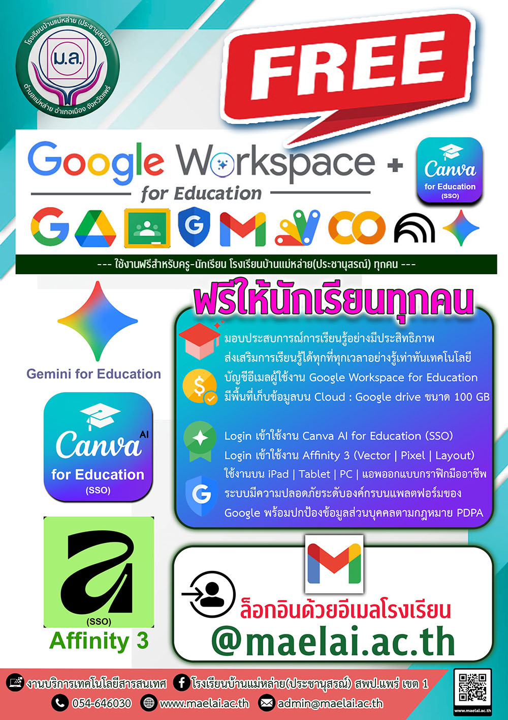 นักเรียนทุกคนจะได้รับบัญชีอีเมลผู้ใช้งาน Google Workspace for Education (ตัวอย่าง e-mail : 1234@maelai.ac.th)